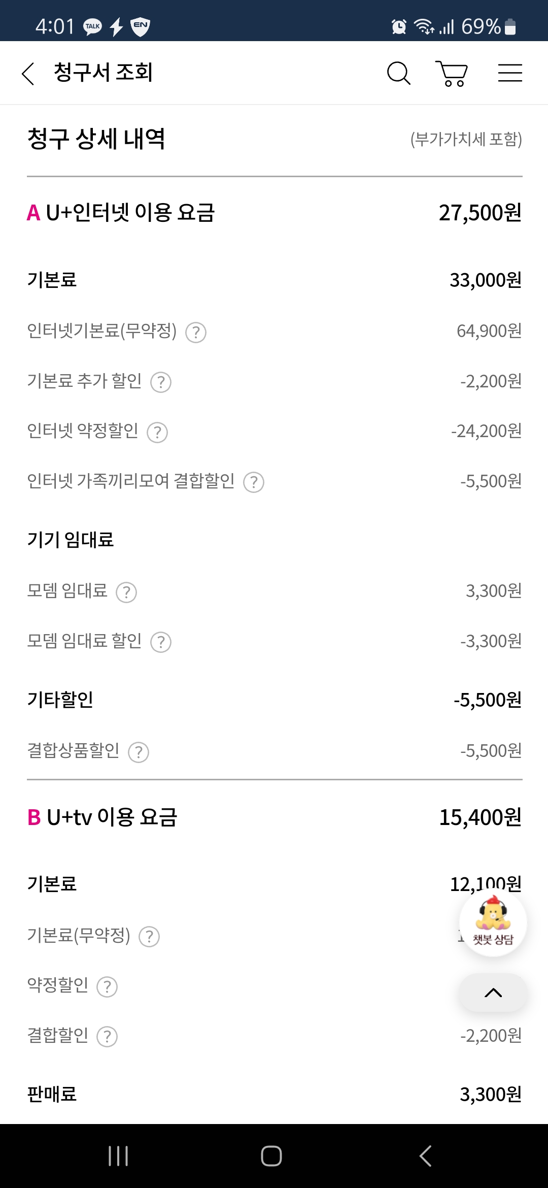 가족들과 유무선 결합 할인도 되어있고, 인터넷끼리 할인도 되어있는 상태인지라