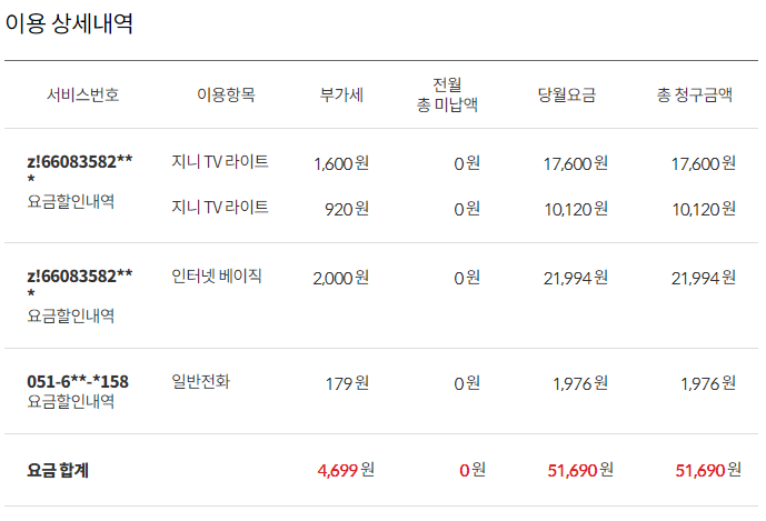 51,700원(인터넷 25,300원+TV 1대당 13,200원씩+전화 면제)이 합산 청구됩니다.