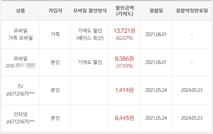 안녕하세요. 경북 경주에서 KT 폰,TV,인터넷을 아래와 같이 프리미엄 가족결합중입니다.