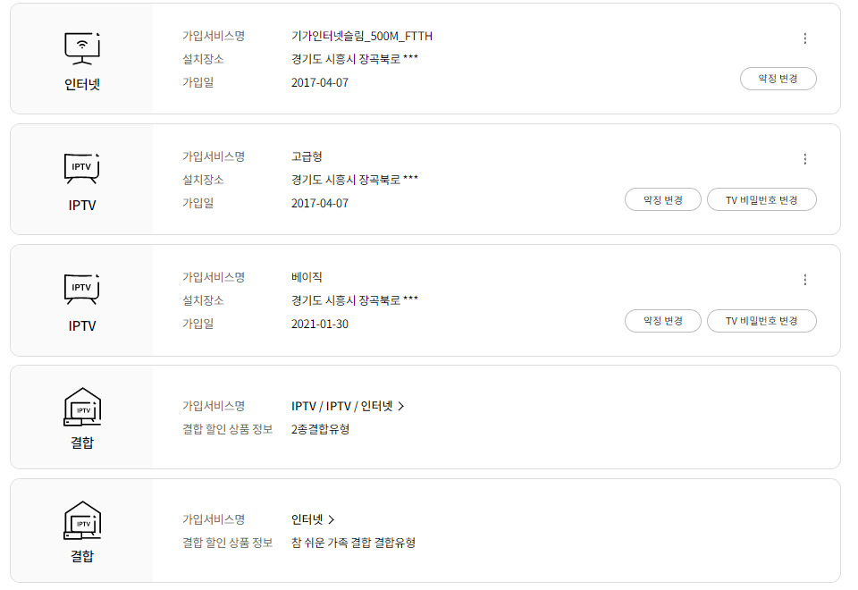 현재 이렇게 사용중입니다 왜인지는 모르겠는데 tv가 2개 가입 돼 있어요 ㅠ