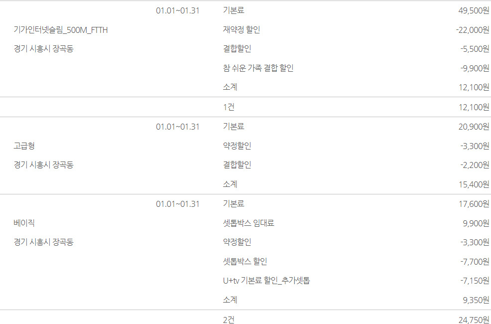 LG 500메가급 + 고급형 + 베이직 = 총합 36,850원인데요~!