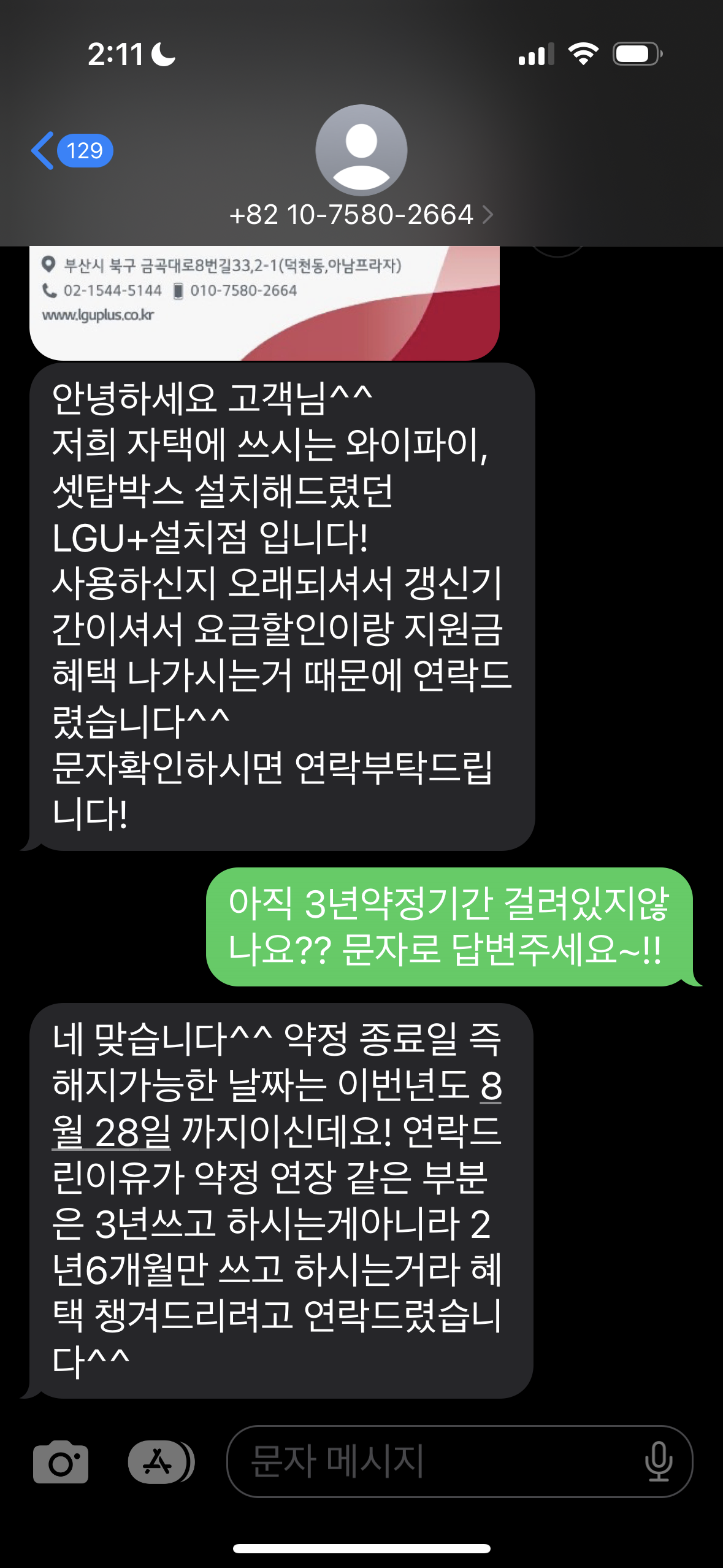 위에 살짝 캡쳐된 명함을 보니 LG유플러스 하청의 부산 설치센터 법인 소속자가