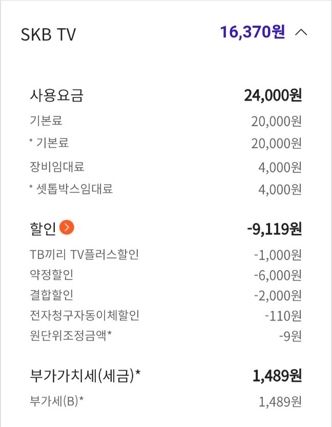 => TV 2대 가입 시 총 월요금은 53,570원이 되어요.