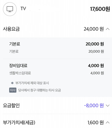 서비스 센터에 문의 했을 때, 3년 재약정 기준 요금 할인 인터넷 3,600/TV 3,600원 36개월 259,200원 + 140,000원 상품권
