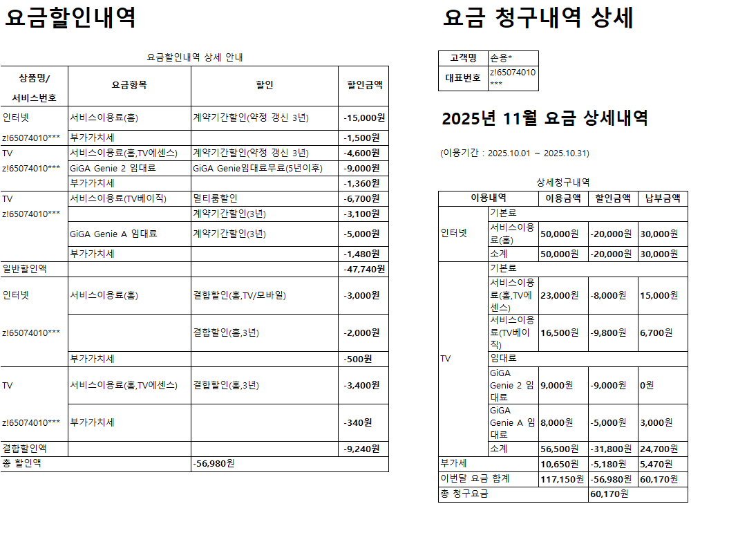 그래서 인터넷,TV를 알아보니 약정이 한참 전에 끝났습니다. 그런데 약정할인은 쭉 받고있었습니다.(+결합할인)