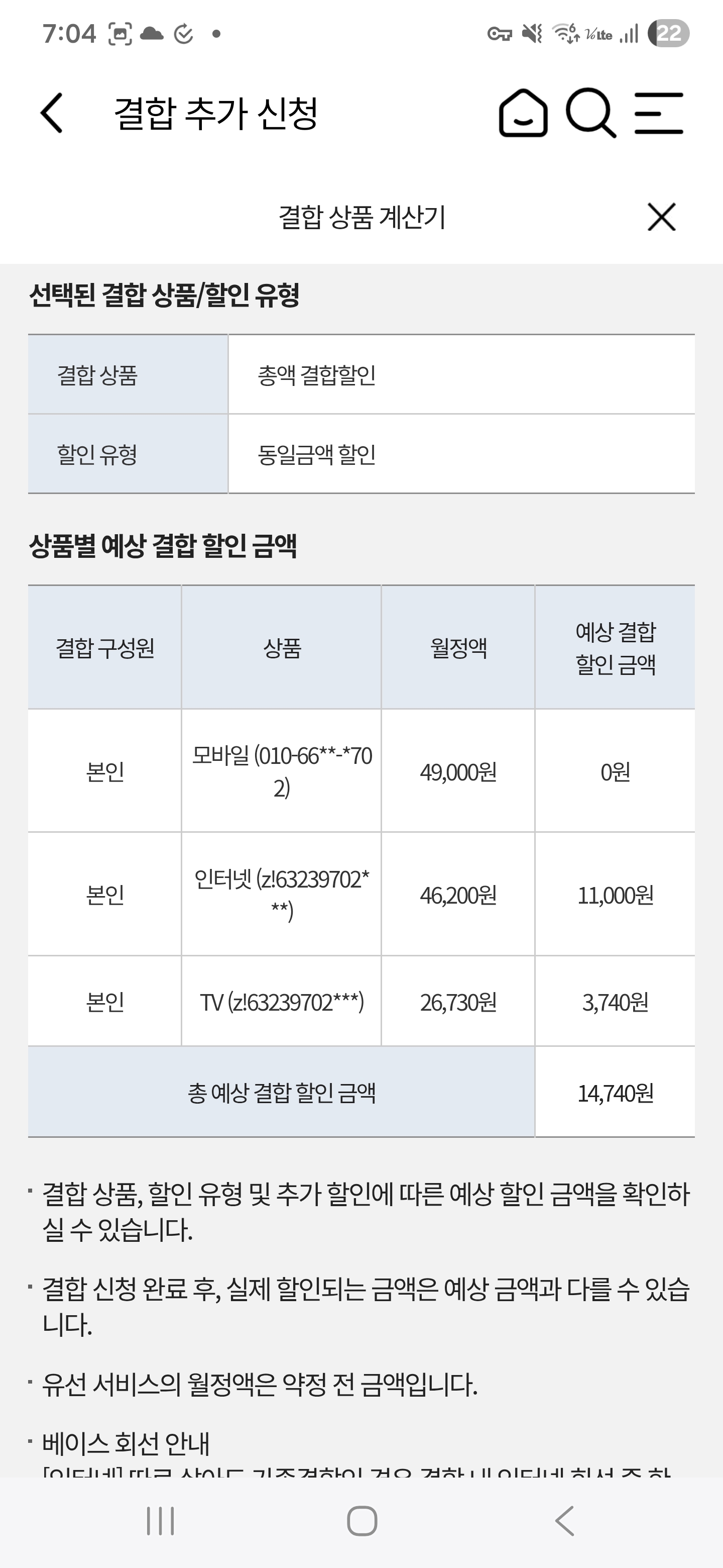 - 인터넷과의 결합 할인 3,000원 적용되어,
