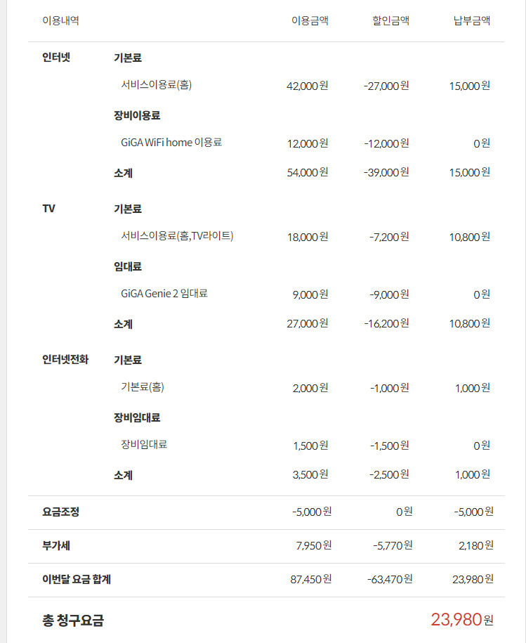 이번 신규 SK 500메가급 + 공유기 + 기본 티비 1대 = 총요금은 34,650원이 되고요~!