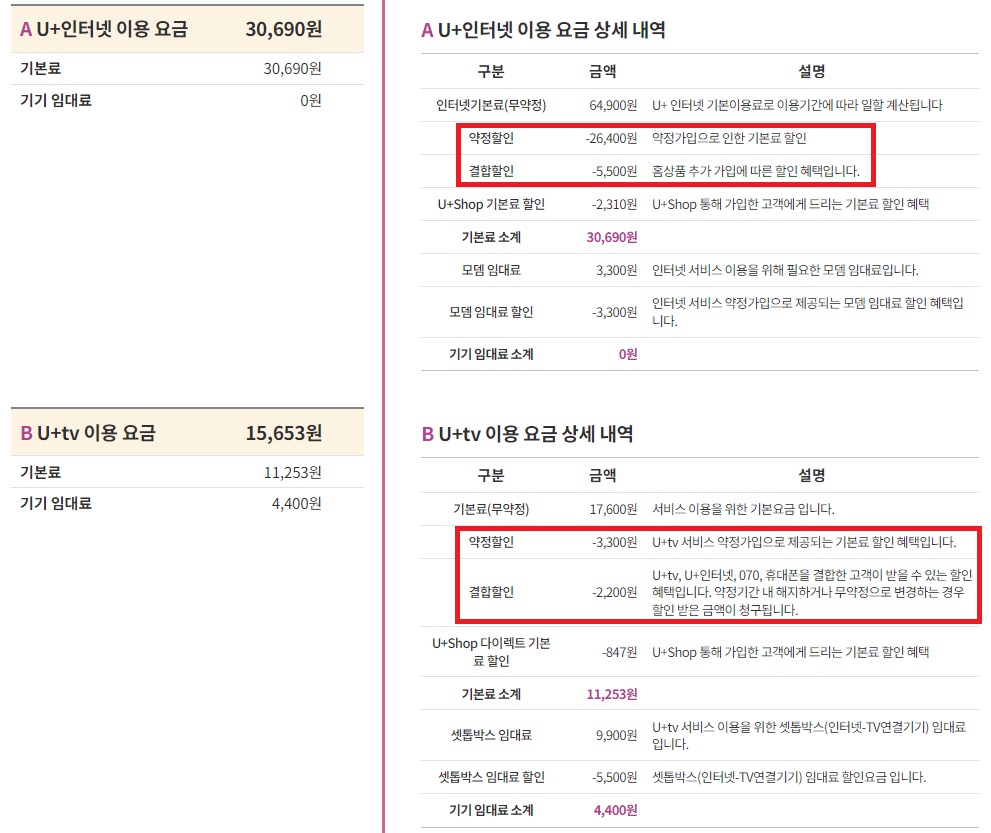 결합아닐시 41,390원 (셋톱임대비만 차감)
