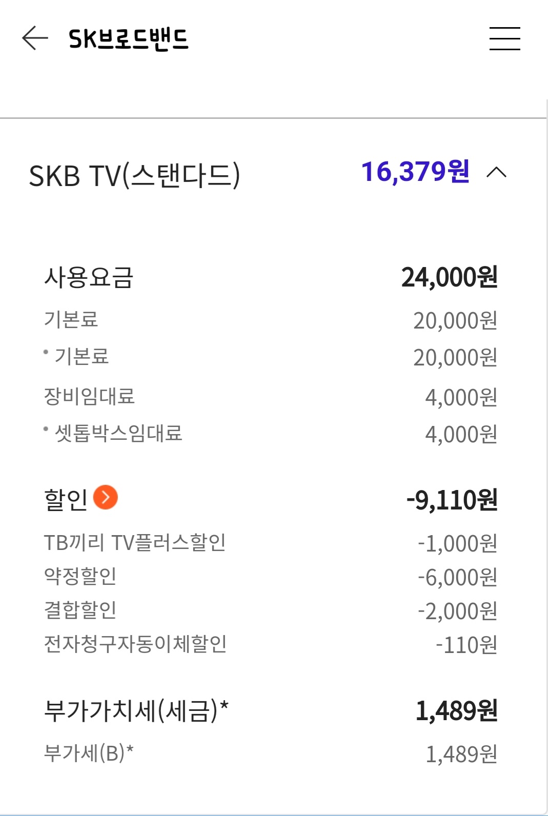 1. sk 브로드밴드 인터넷(광랜)+tv(스탠다드)를 사용: 매달 34,892원 납부하고 있고요.