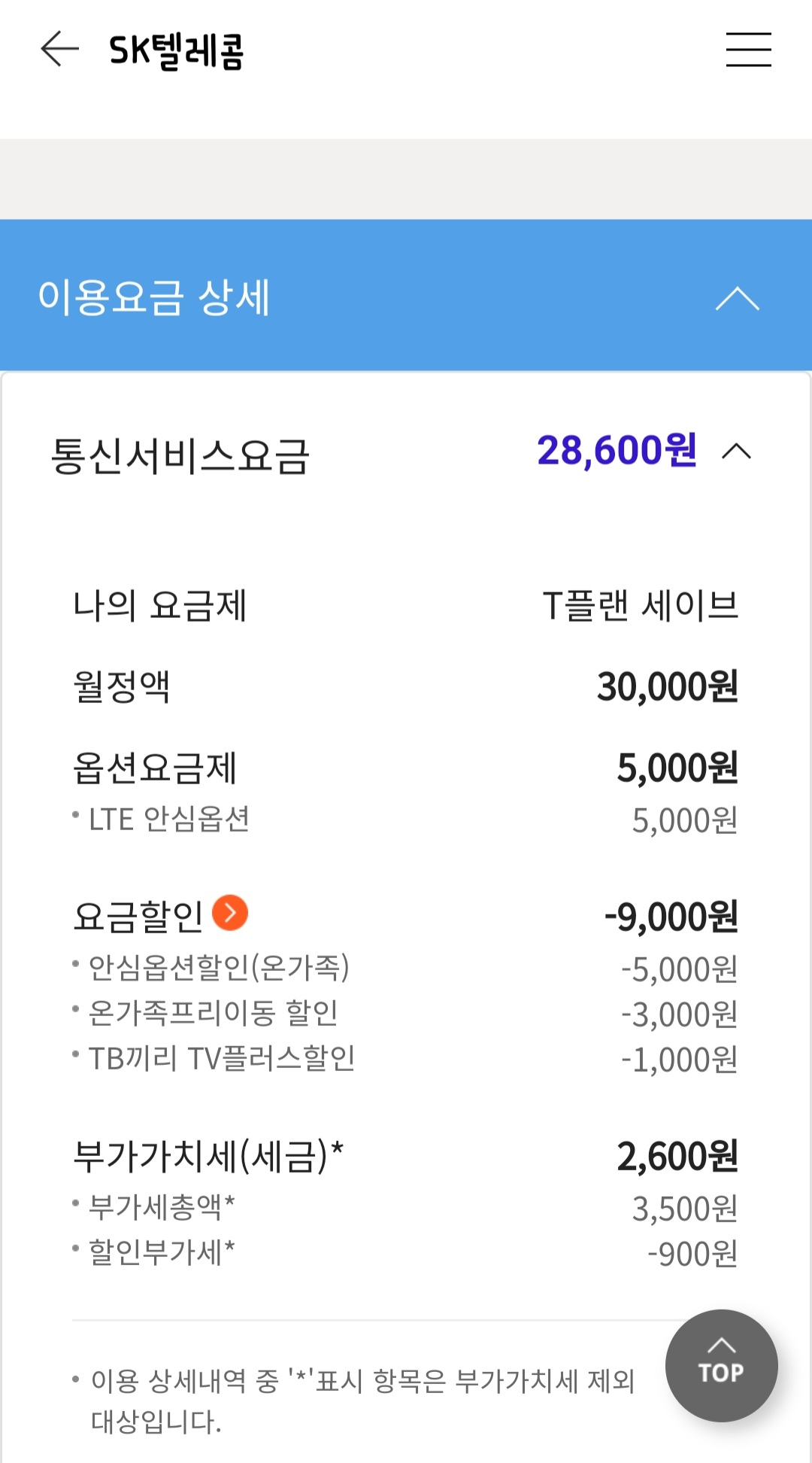 SK휴대폰 1회선을 결합해 "온가족프리"를 적용 받고 계시네요ㅎㅎ