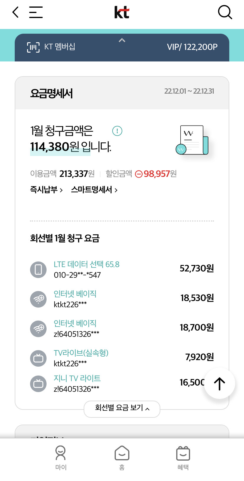 우선 저는 kt 모바일과 티비, 인터넷을 다 사용하고 있구요, 우선 현재 요금상태는 아래 사진과 같습니다.