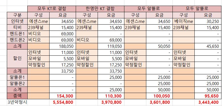 [모두 KT로 결합], [한명만 KT 결합]하는 경우에서 잘못된 할인이 있습니다^^;