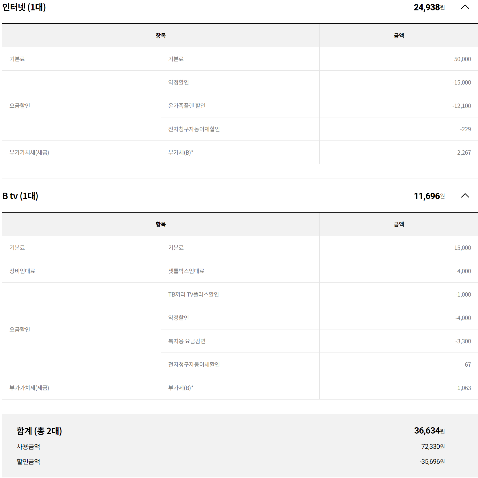 특이사항으로는 할머니께서 복지할인 대상이셔서 Btv만 매달 3,300원 요금 감면을 받아왔습니다.