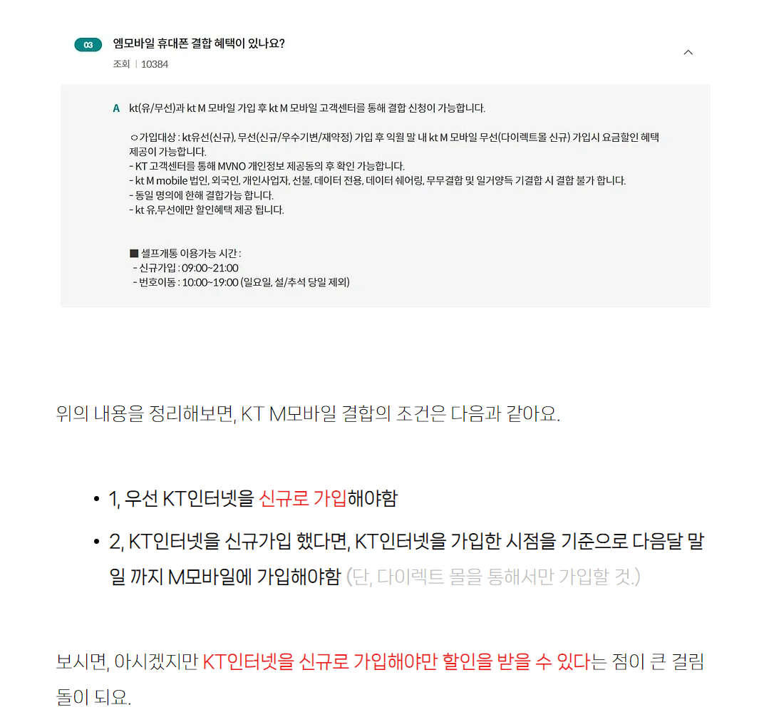 휴대폰은 KT M모바일 알뜰폰인데, 알뜰폰임에도 불구하고 KT인터넷을 신규로 가입한 사람 대상으로 결합이 가능하다고 하더라구요?