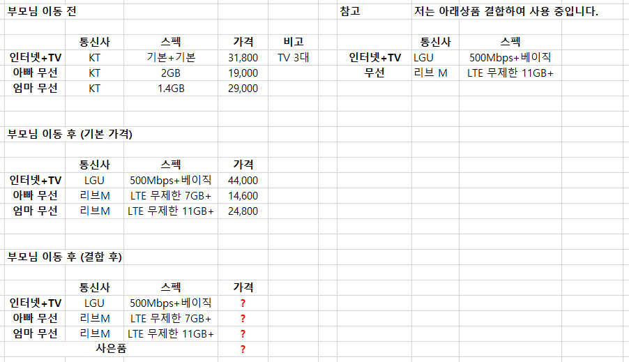 부모님 댁 인터넷+TV+무선 약정이 끝난 상태셔서 (KT), 저랑 동일하게 LGU + 리브모바일로 엮으려고 합니다.