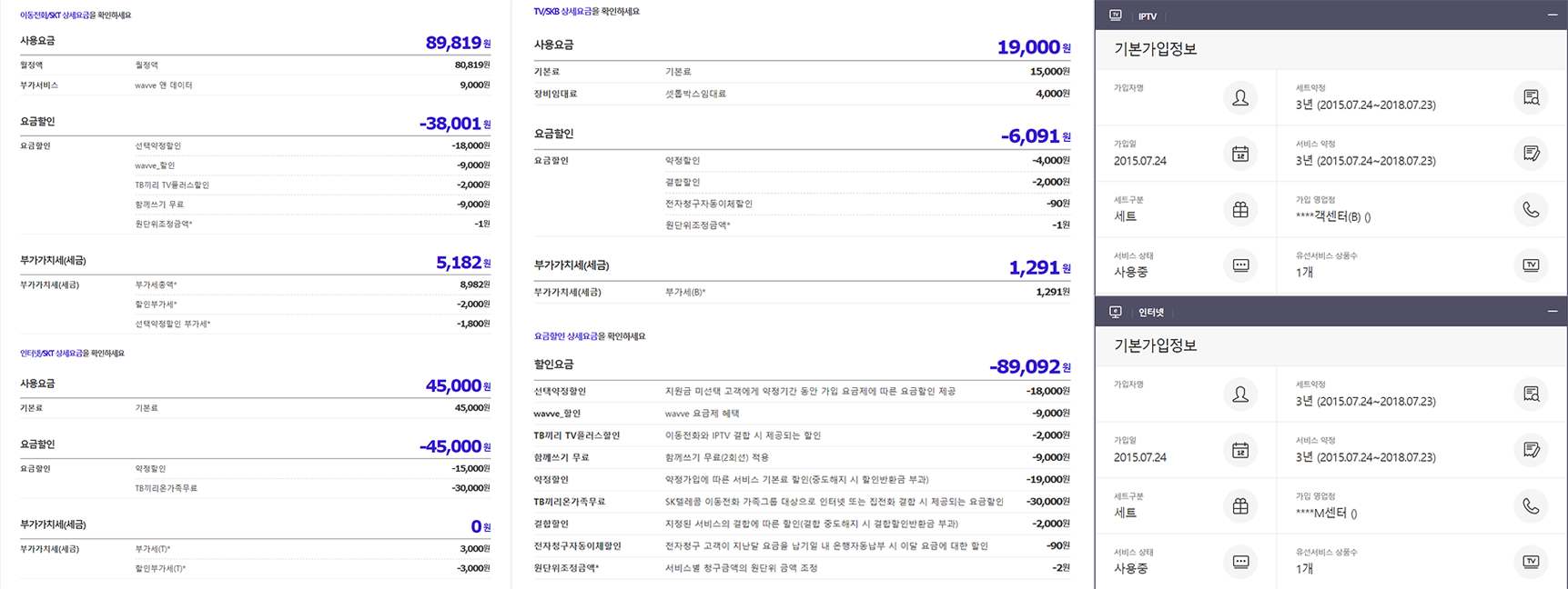 SKT에서 가족결합으로 인터넷을 묶고, SKB 에서 IPTV를 이용하고 있네요.