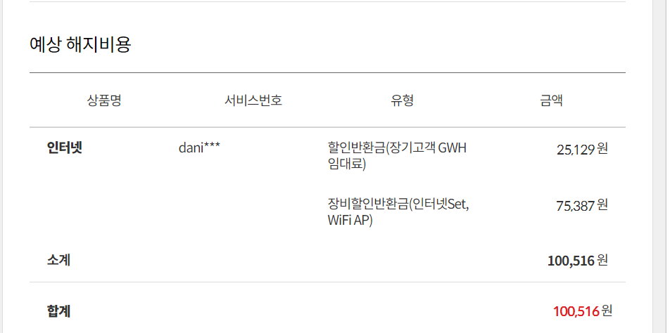 가입 현황과 할인 현황, 할인항목, 해지비용입니다