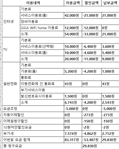 제 계산이 맞다면, 만약 sk 인터넷만 추가하게 되면 > 직영 계약시 14000원 추가, 총 납부금액 29830원+14000원 = 43830원.