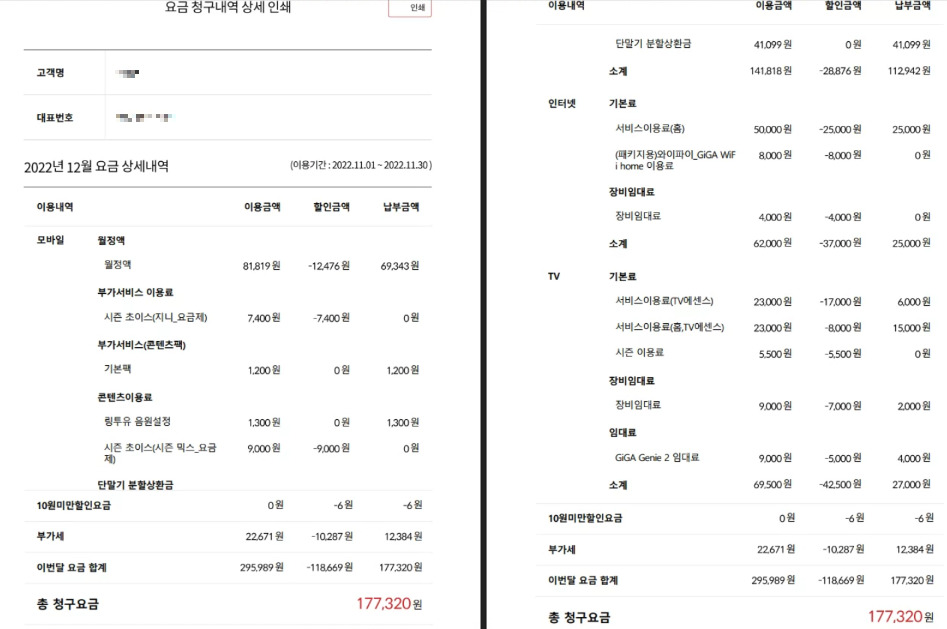 현재 제 명의이고 휴대폰 요금이 9만원 요금제를 사용하기에 총 합산된 청구요금이 다소 높습니다.