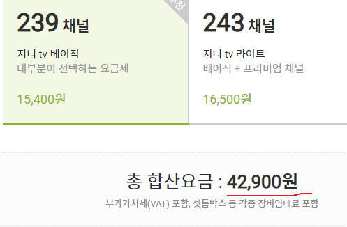 대중적인 500메가 +지니TV 베이직(기가지니A 셋탑박스) 기준으로 조건을 살펴보면