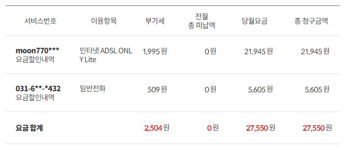 현재 집전화와 인터넷만 사용중이며(인터넷 ADSL ONLYLite)이며 요금은 30,000인데 복지할인 30% 적용 중입니다.