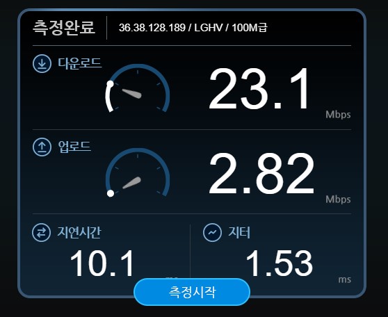다운로드속도가 23Mbps(메가비피에스)밖에 안나온다. 비대칭형이여도 다운로드 속도는 잘 나와야 하는데,