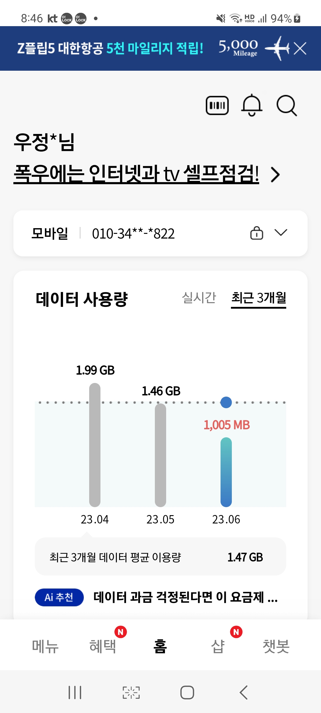 매달 5GB를 다 소진하지 못하신다면 차라리 더 저렴한 요금제를 사용하시는 편이 낫지요 ㅎㅎ