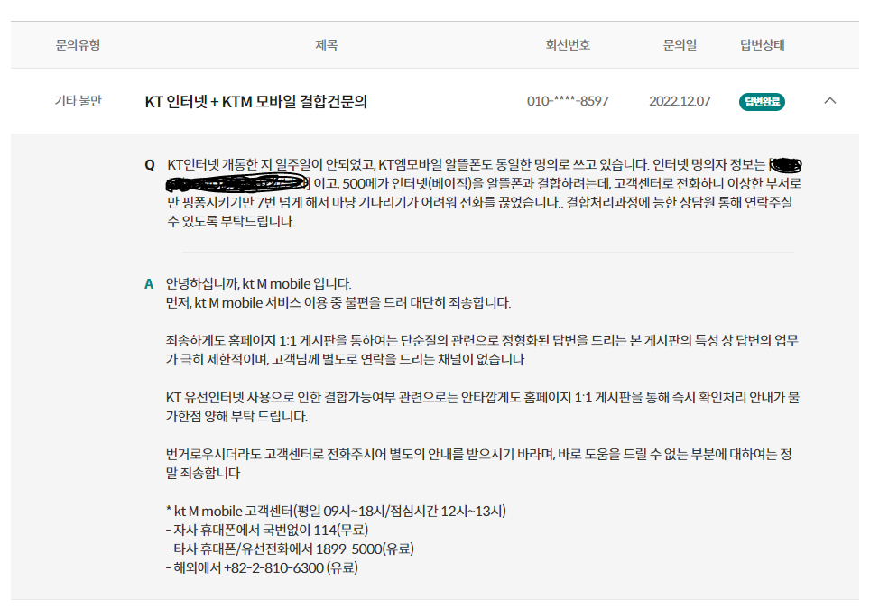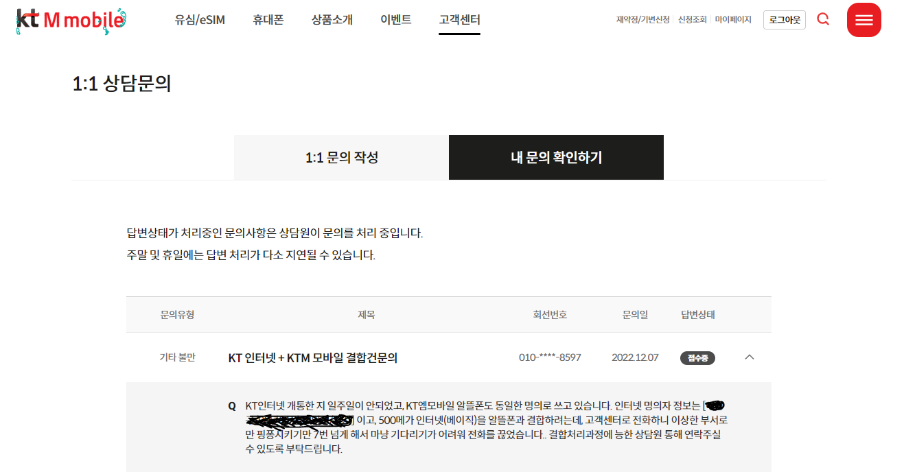 해서 KT엠모바일 고객센터 1:1 상담문의를 남겨보시길 권해드립니다.