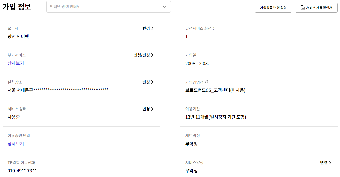 - 현재 사용중인 SKB 가입정보 첨부이미지 참조