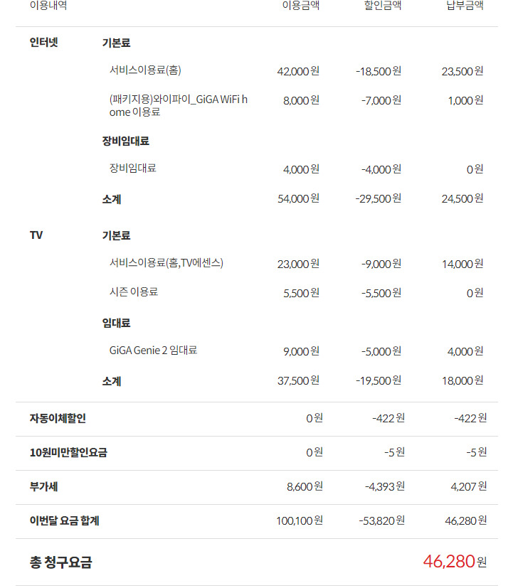 납부요금을 보면 받고 계신 할인이 크게 없는데도 불구하고..