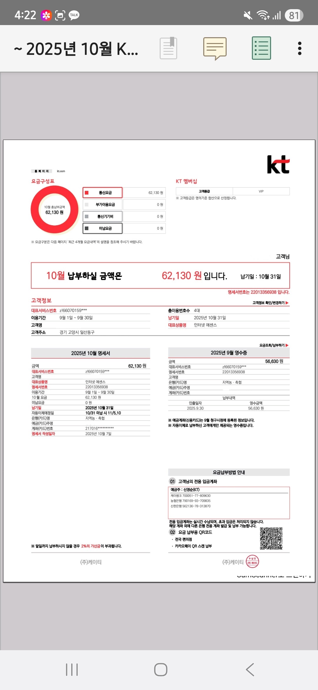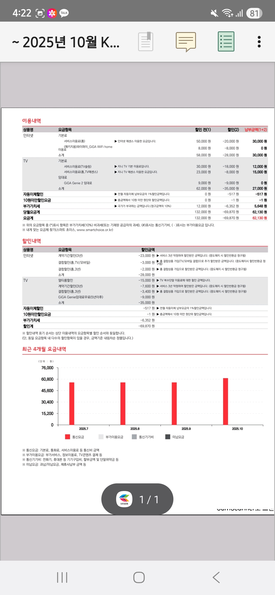 한달 납부 금액은 62,130원 나오고 있습니다.
