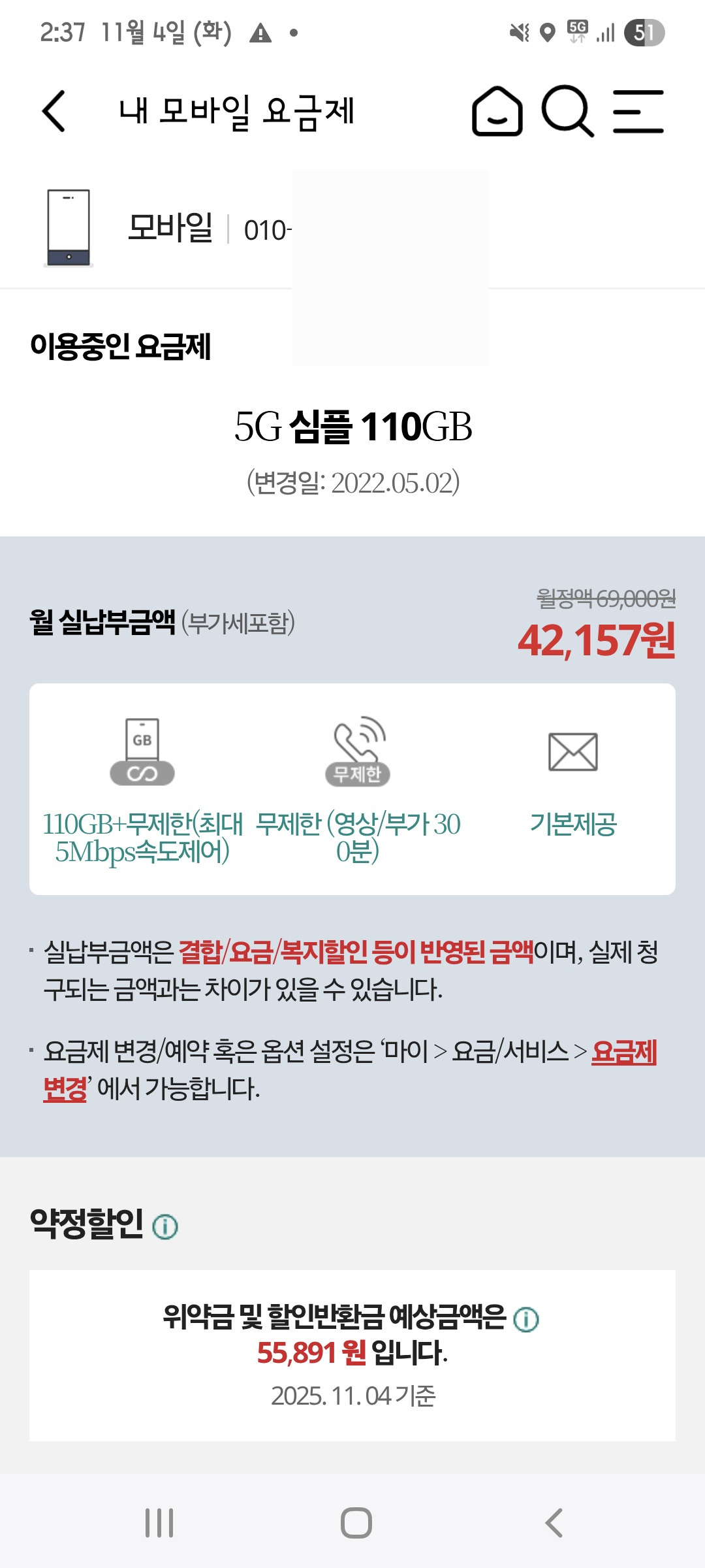5. 현재 사용 중인 핸드폰 통신사 : KT, 요금제:5G심플