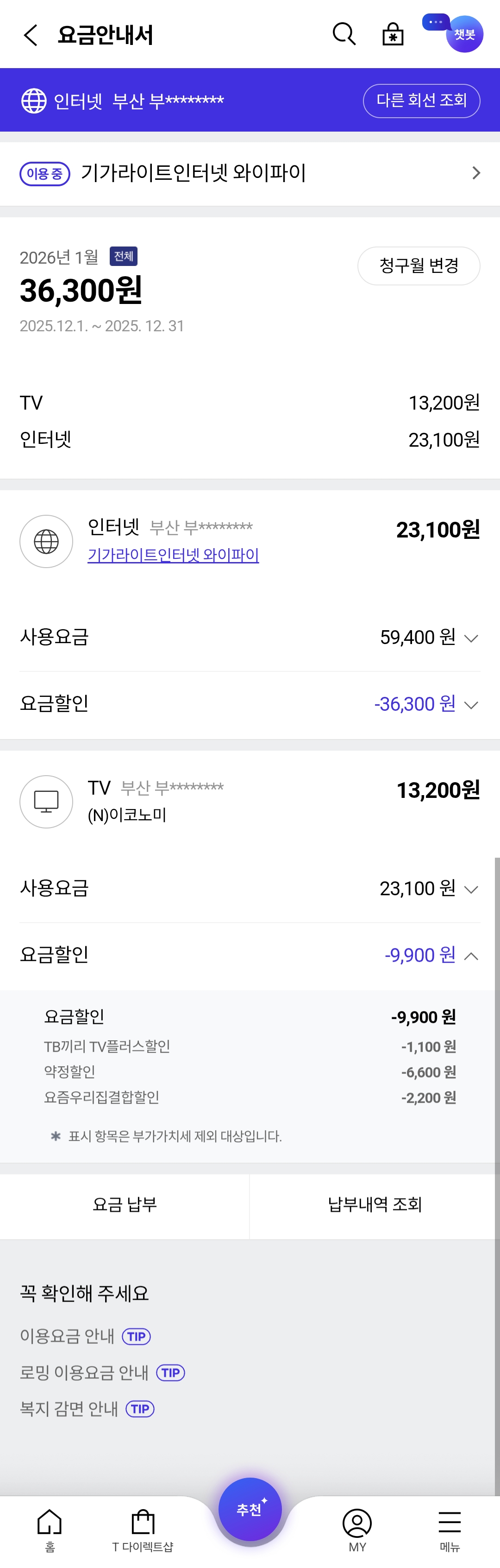 첨부해 주신 이미지에 사용 중이신 인터넷 요금제와 1월 이용 요금 확인만 가능한데요~!
