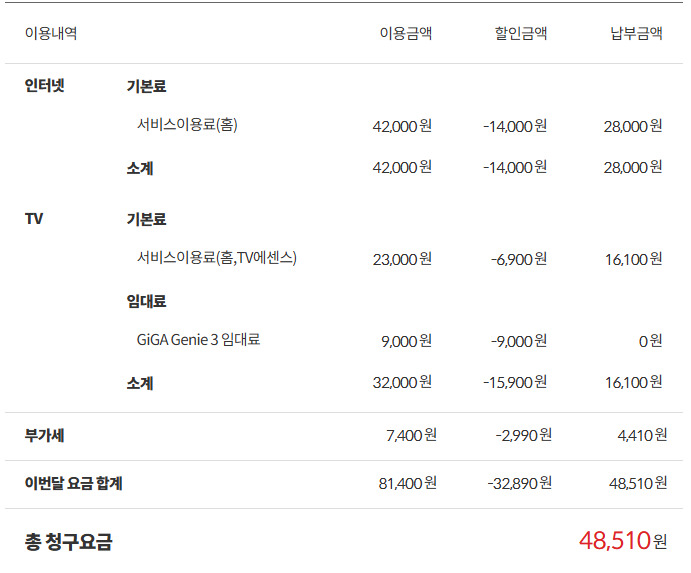 위 월요금보다 5,500원이 올라서요..! 이 경우라면 월요금은 42900 + 5,500 = 48400원이 됩니다.