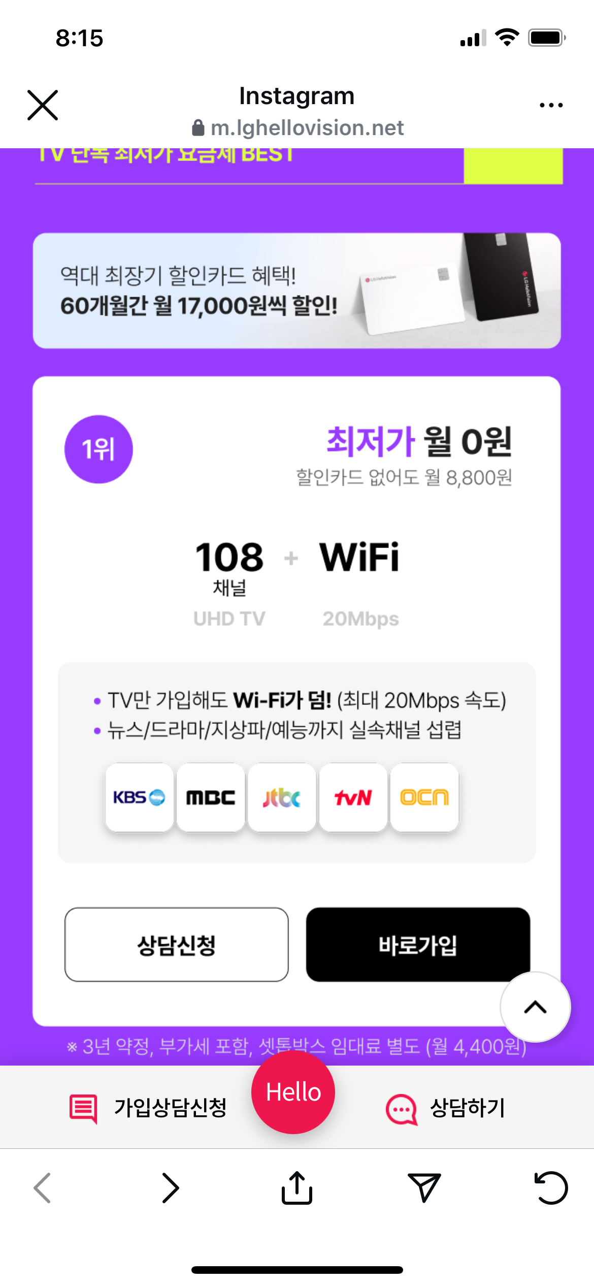 sk브로드밴드쓰다가 약정끝나서 백메가 상담받고 상담원과 통화해서 상품권 받고 다시 1년 약정해서 쓰고 이번에 끝났습니다. 인터넷+티비해서 매달 3만원씩 나가는데 와이파이 주로 사용하고 티비를 잘 보지 않아 최소 요금제로 갈아타고 싶어서요. 광고가 뜨는데 lg헬로우비전에서 인터넷+티비 2만원 상품이 있더라구요. 이걸로 갈아타도 괜찮을지 문의드리고 싶습니다.