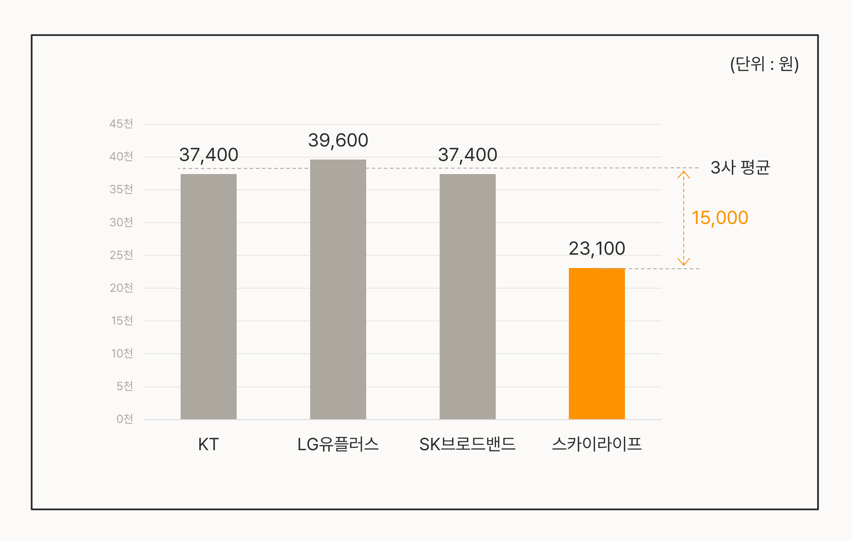 스카이라이프는 3사 통신사보다 약 40% 저렴합니다