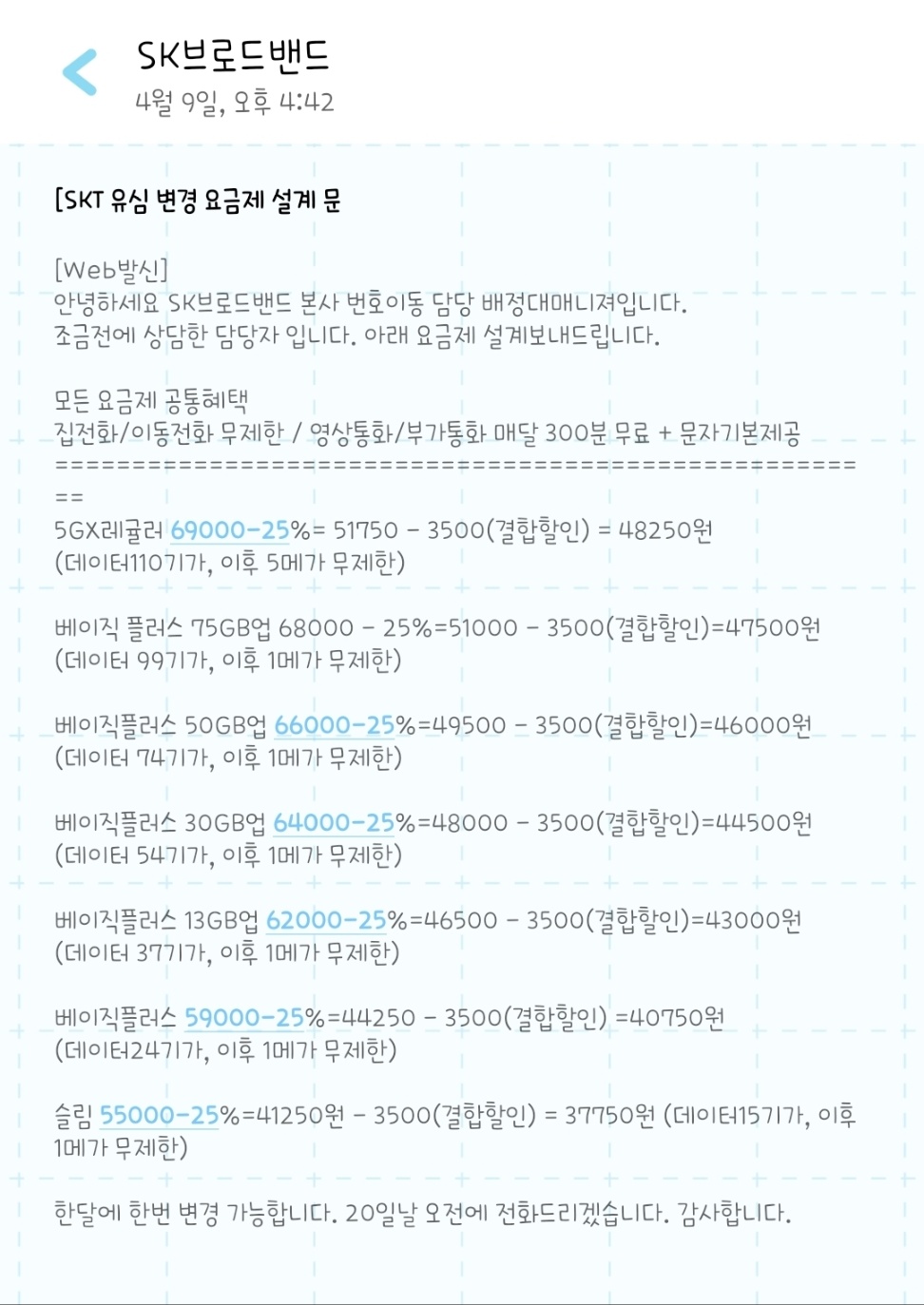 SK측에 상담 받으면서 SK 브로드밴드에서 요금제 인터넷+TV+휴대폰 결합혜택 받을 수 있는 휴대폰 요금제 안내를 주셨는데, 이 부분에 대해서도 의견 여쭈어봐도 될까요? (사진에 첨부해드렸어요!)