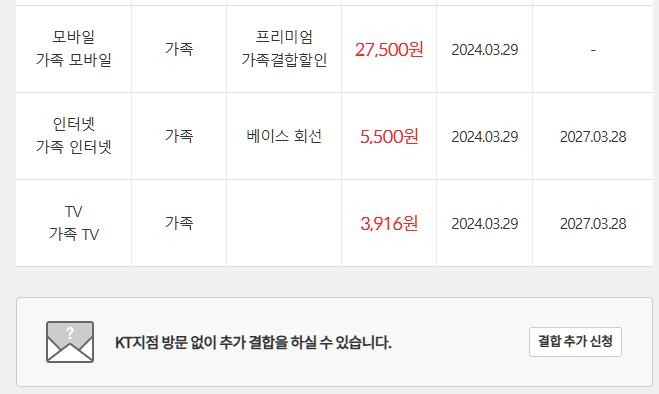 - 가족들 KT폰 3회선 (11만, 2.8만, 10만)은 : 유지 예정! (자택과 '프리미엄 가족결합'으로 결합중)