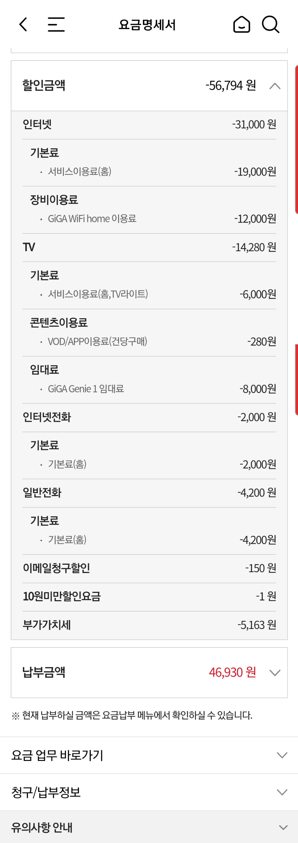 기가급 인터넷+TV 결합 명목으로 5,500원 할인이 적용되어