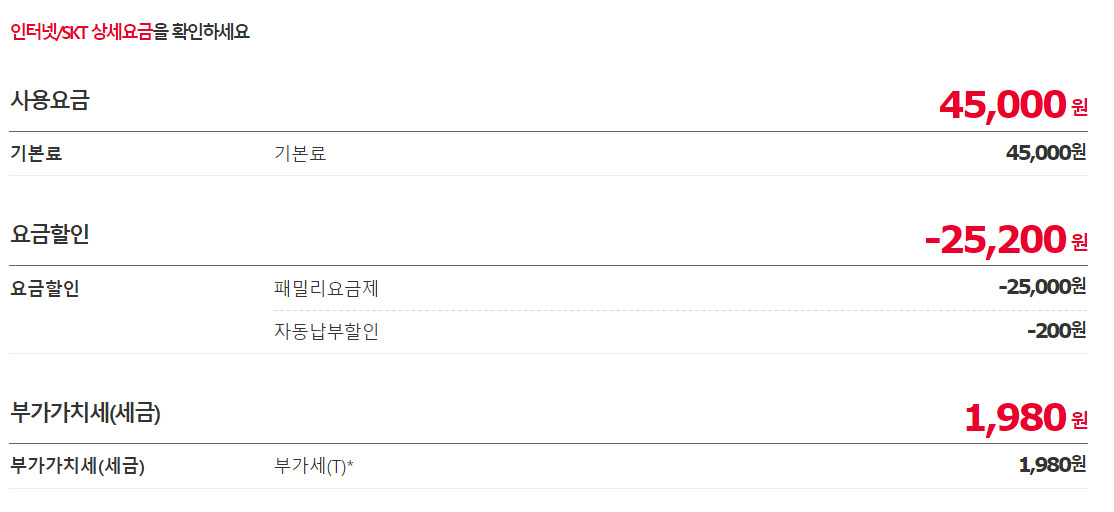 어머니 - band 데이터 2.2G (월 46,200원) / 인터넷 - T광랜 인터넷(100M) (월 0원=33,000원-약정할인(13,000)-TB끼리 온가족 무료(20,000))