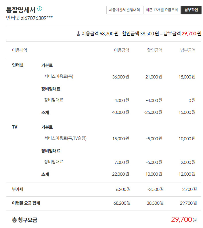 그리고 별도로 인터넷+TV 설치비 38,500원이 청구됩니다.
