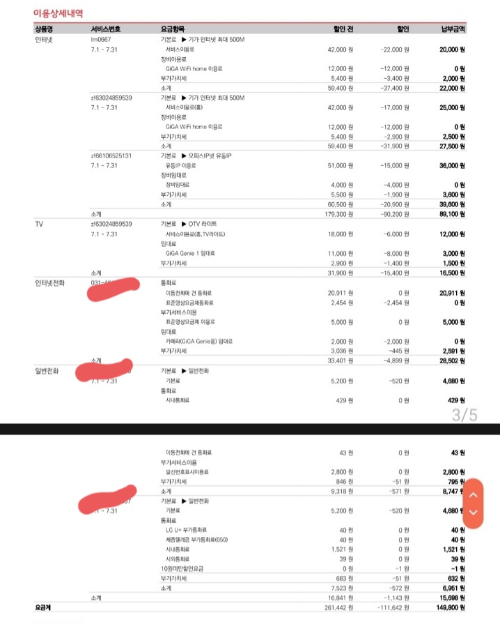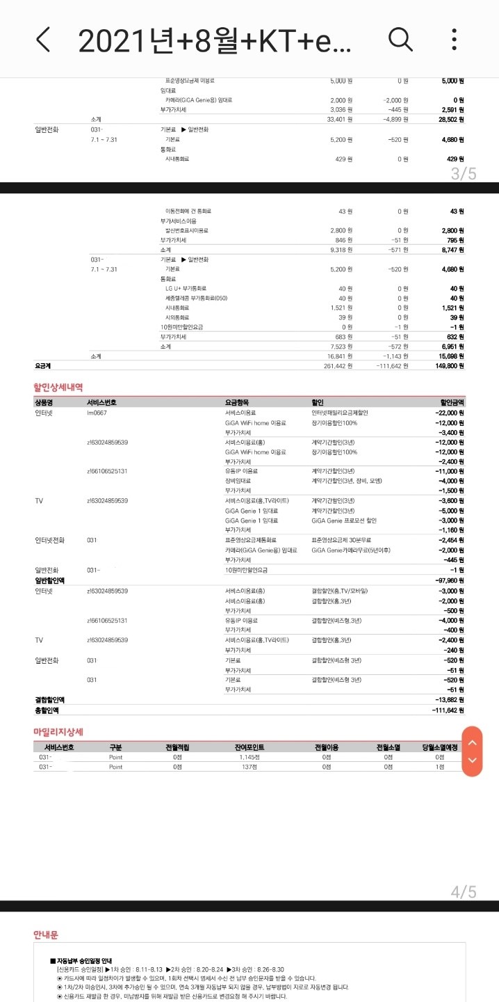 2. 집전화 사용량은 한달에 5건 내외입니다. 없을때도 있어요.