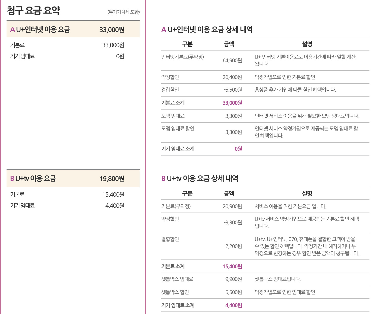 할인액을 포함하면 인터넷 요금은 33,000원이 아닌 19,800원이 됩니다.