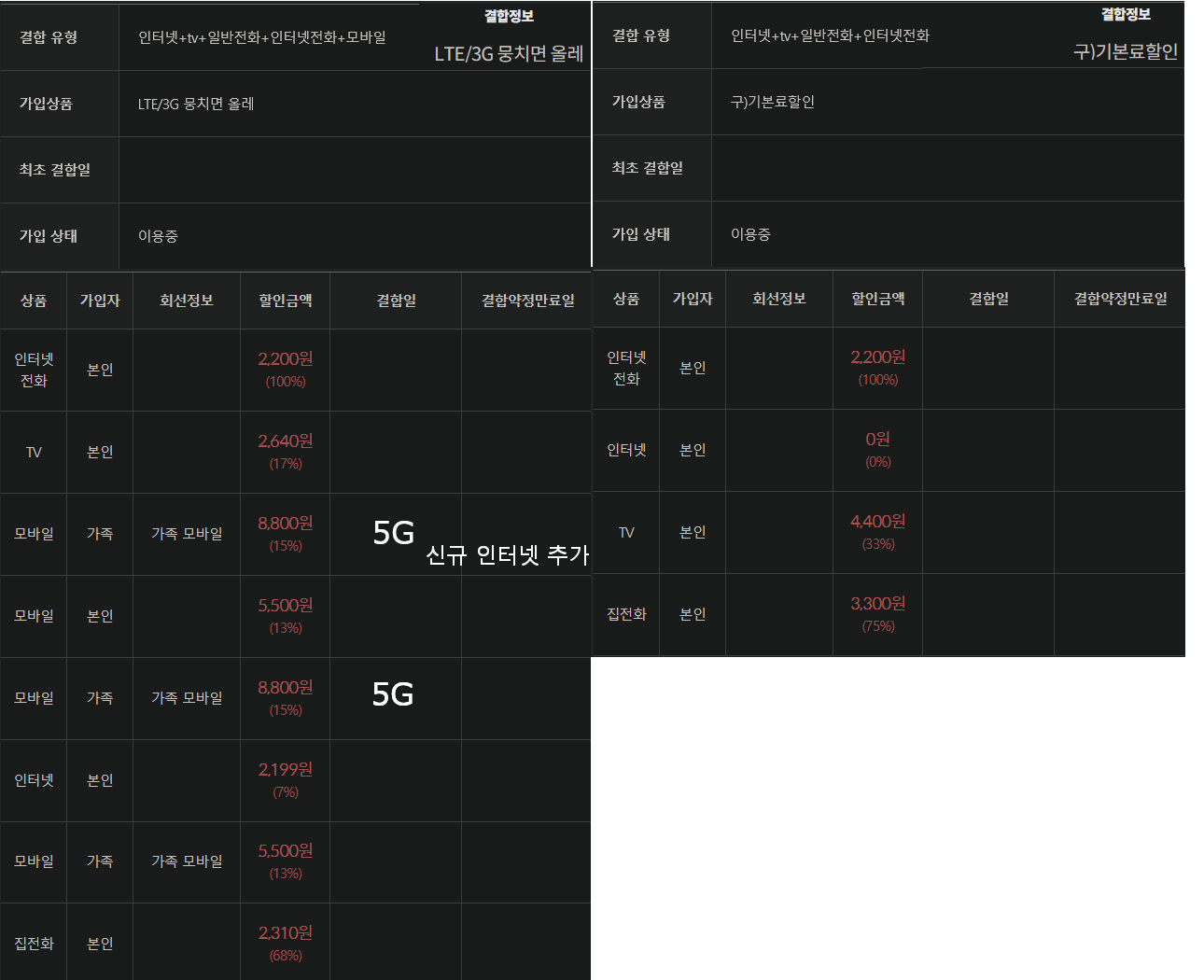 결합상품 변경으로 적용될 5,500원 할인이 중복으로 적용되지 않을 수도 있습니다.