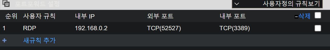 물론 내부포트는 3389(윈도우 원격 데스크탑 어플리케이션의 기본 포트)가 되어야 하고요!