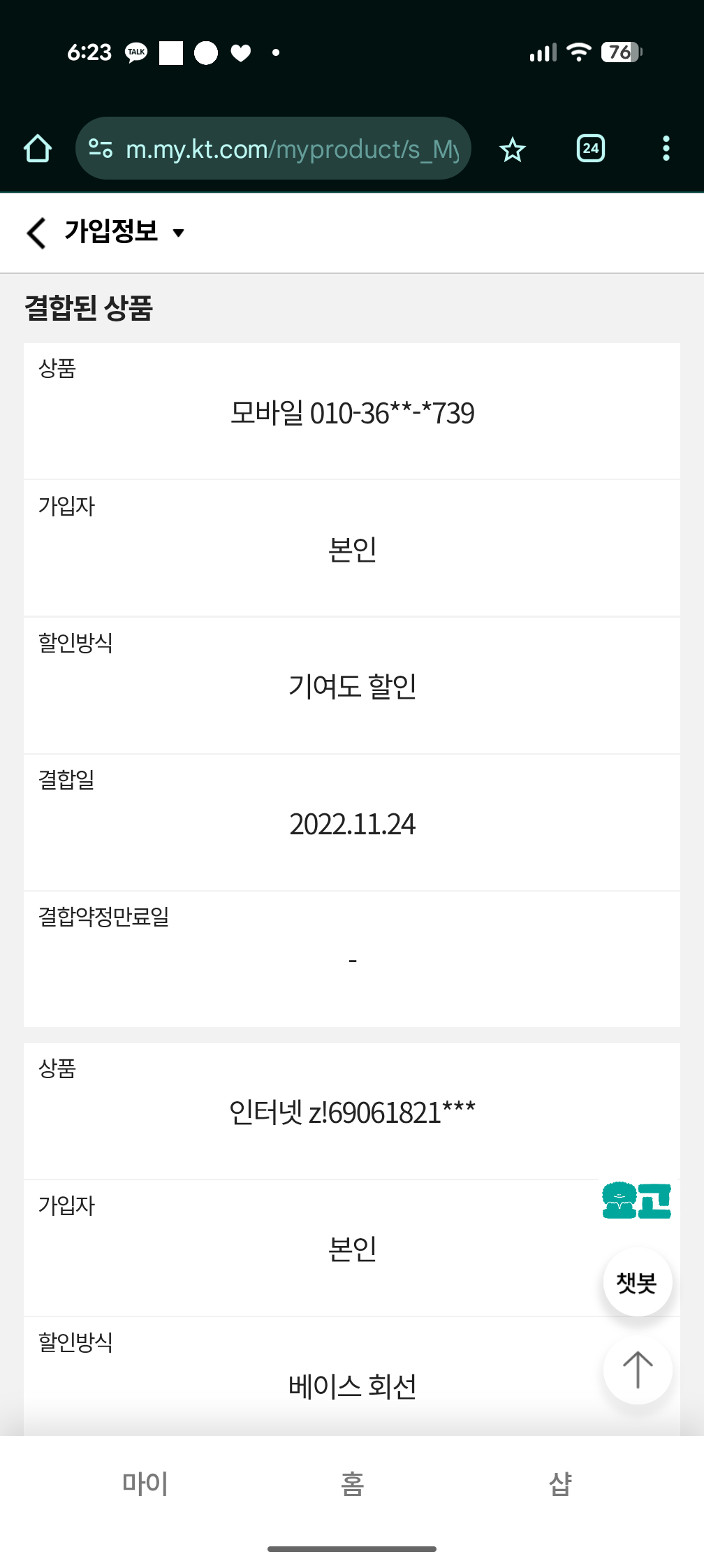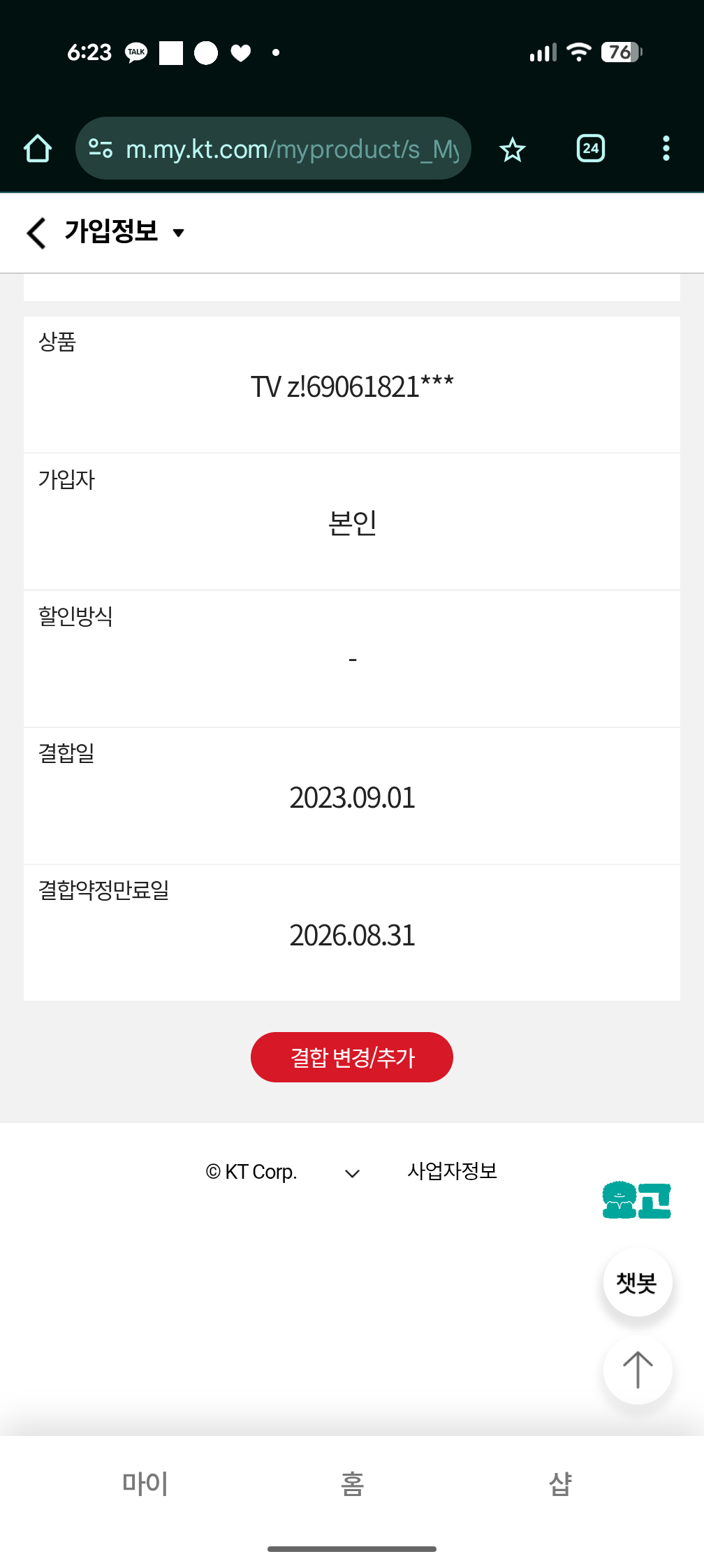 현재 kt인터넷+tv 이용중이고, 핸드폰까지 결합되어 있습니다.