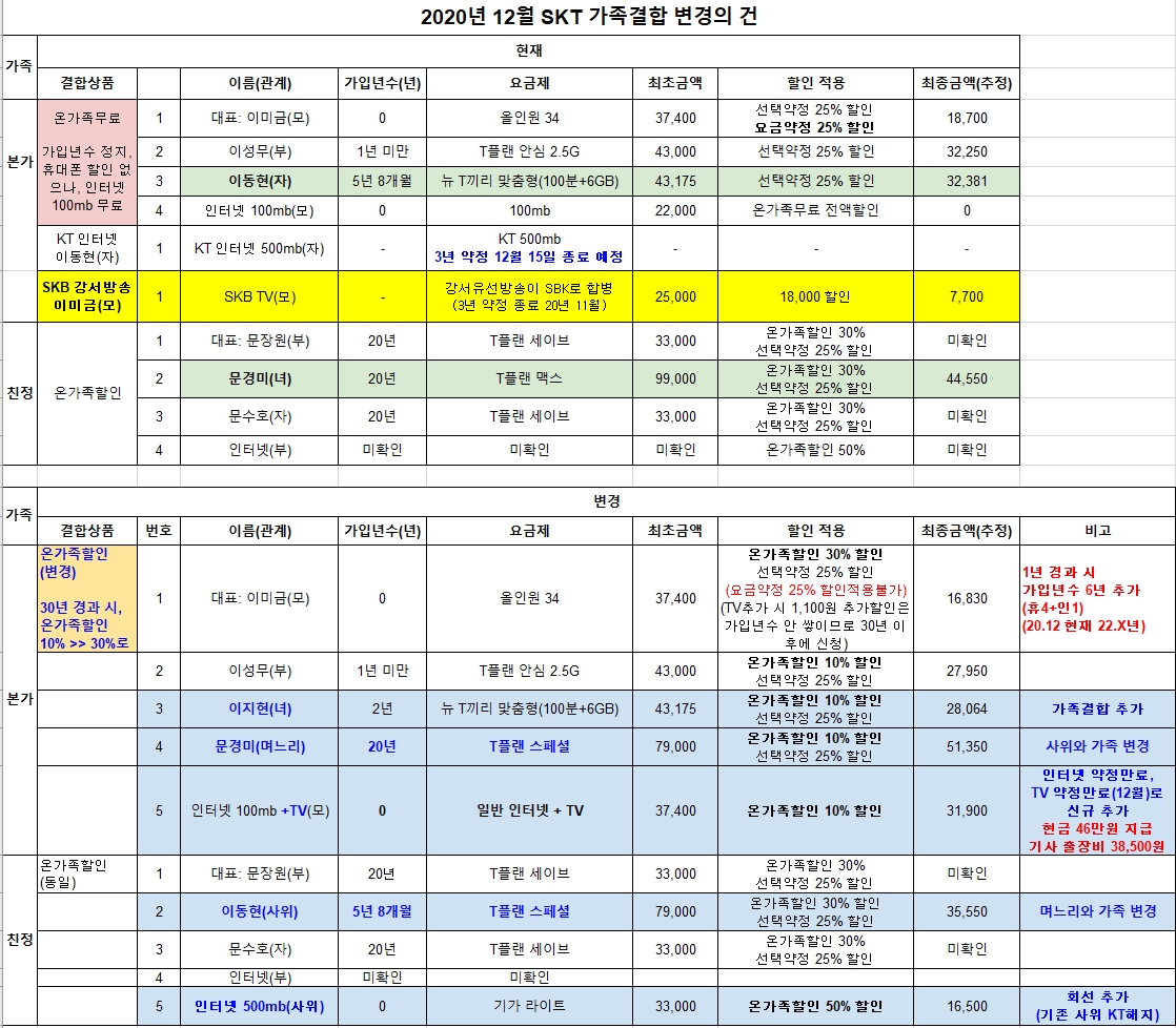 여기에 KT를 해지하고 제 명의로 SK 인터넷 500mb (+ TV는 추가여부 고려중) 추가하여 휴대폰 3회선, 인터넷 2회선을 온가족무료에서 온가족할인으로 변경하고 싶습니다.