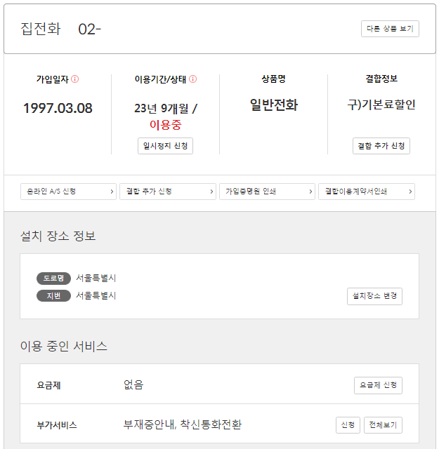 - 집전화 : 가입일자 1997년 3월, 이용기간 23년 9개월, 상품명 '일반전화' 5,200원짜리
