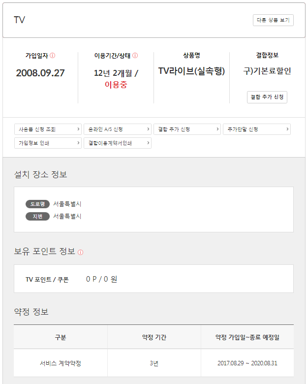 - TV : 가입일자 2008년 9월, 이용기간 12년 2개월, 상품명 'TV라이브(실속형)' 12,000원짜리