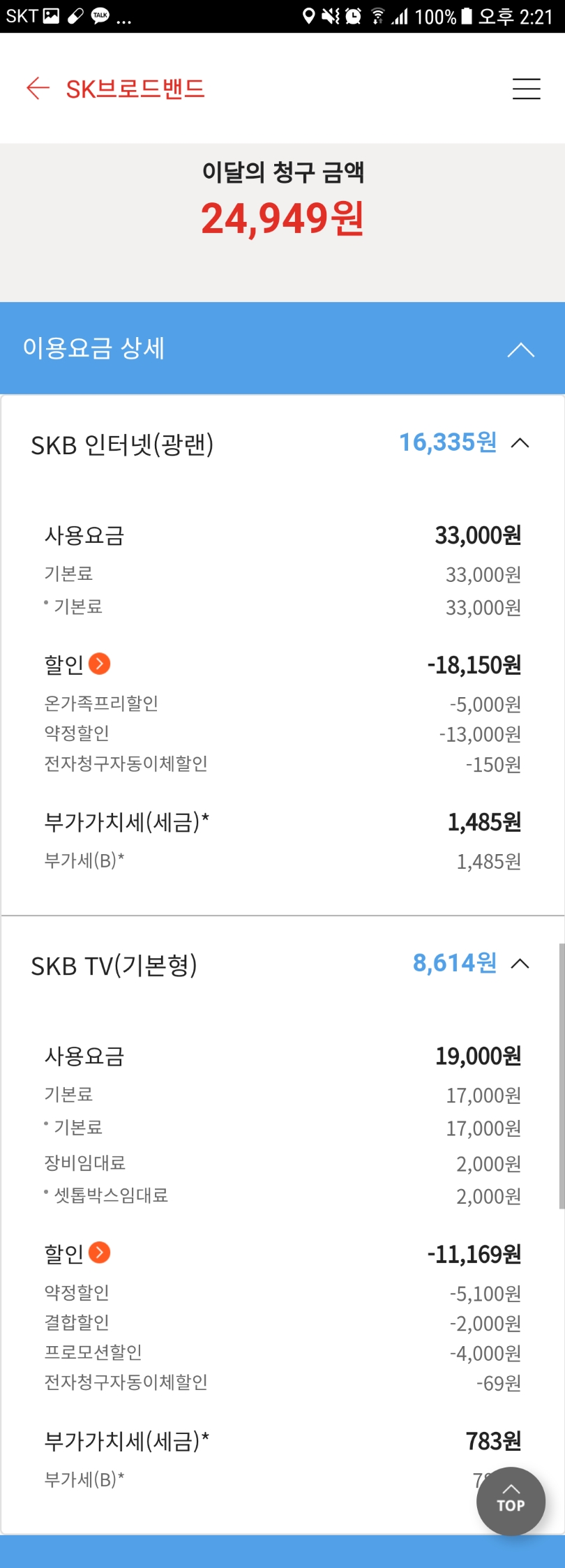 요금 할인을 받아 인터넷과 TV는 저렴하게 사용하고 계신 상황입니다.